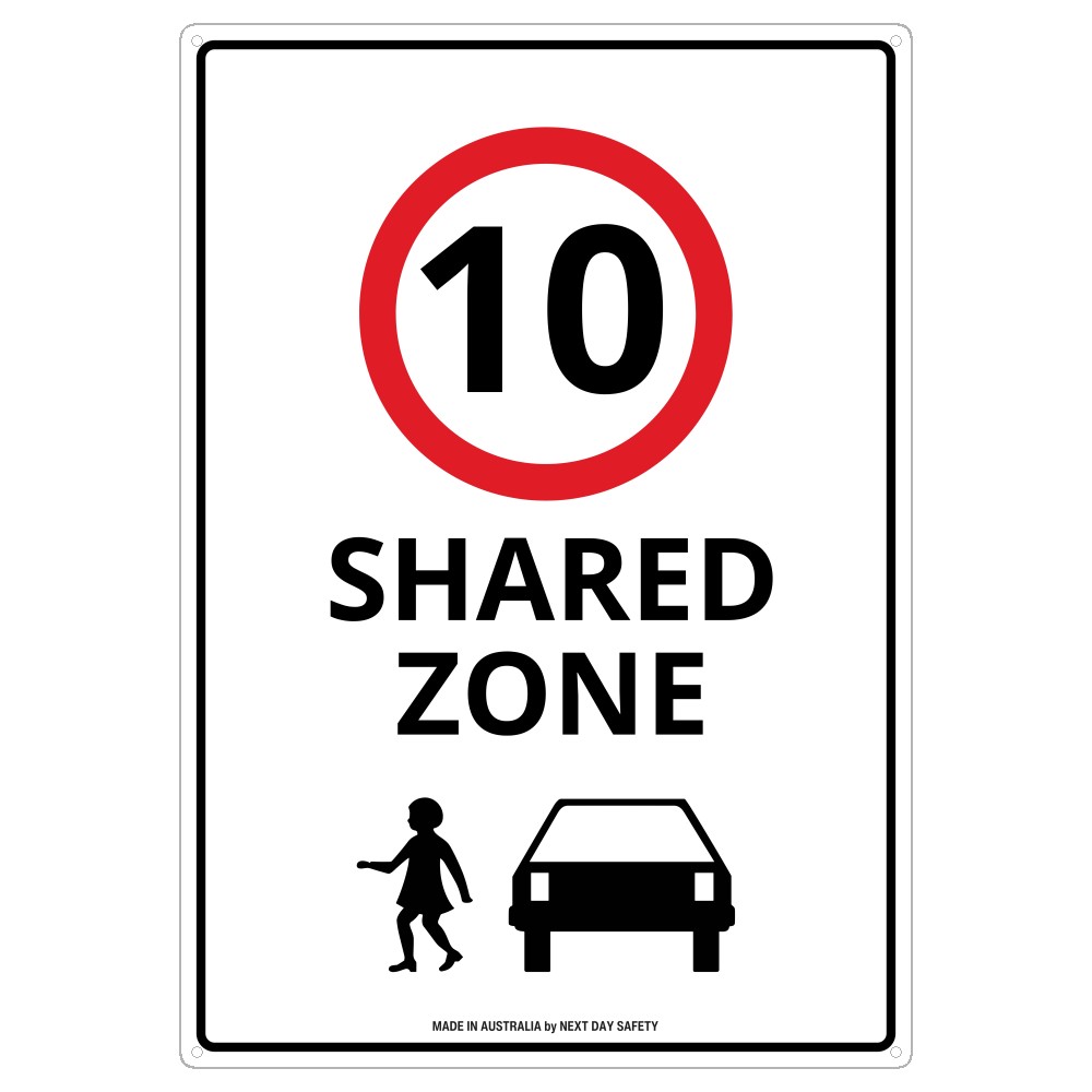 A speed limit sign featuring the number 10 inside a red circle, above the words ‘Shared Zone.’ The sign also displays a silhouette of a pedestrian and a car to indicate a mixed-use area where vehicles and pedestrians share the road.