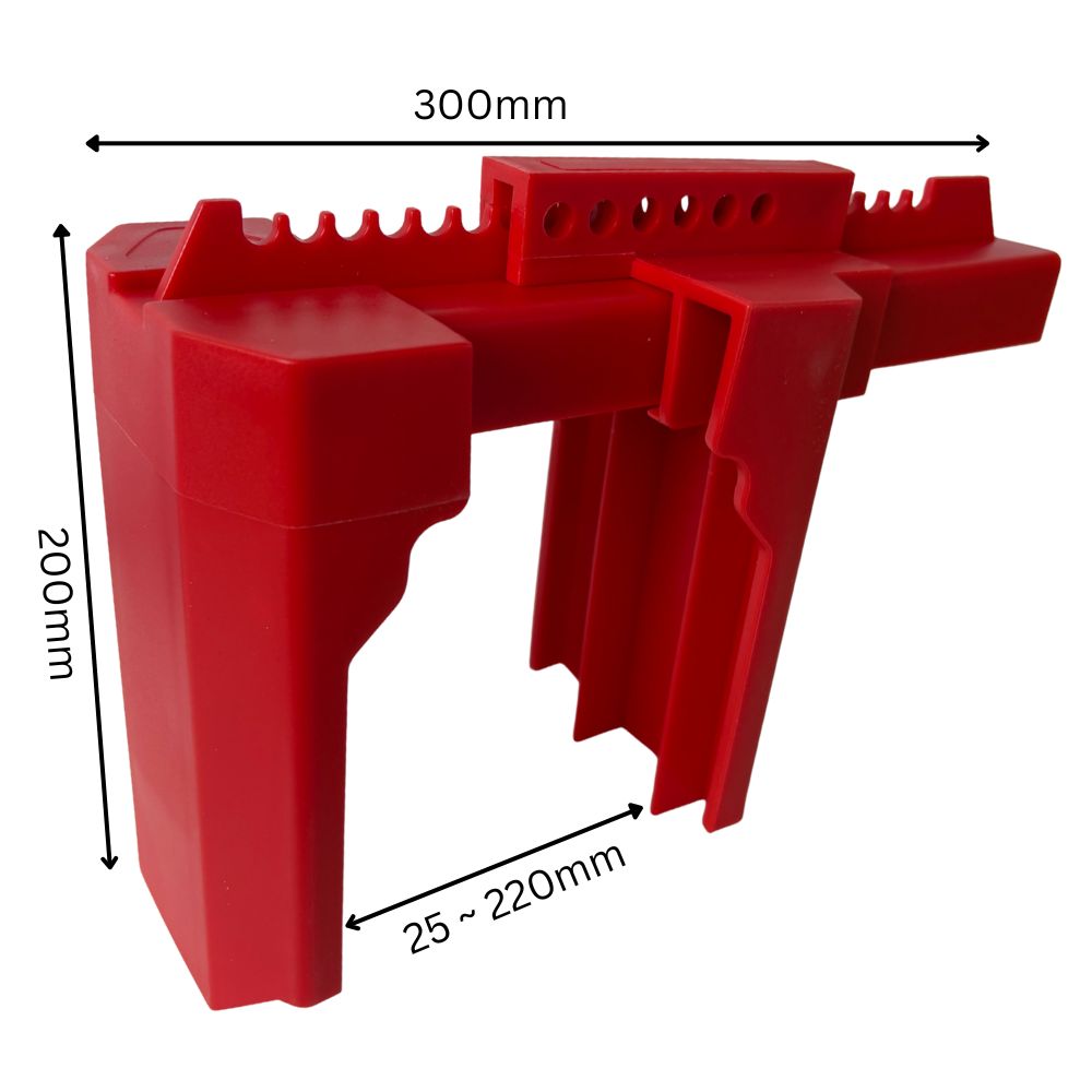 Adjustable device to lockout a range of ball valves. Available in two sizes