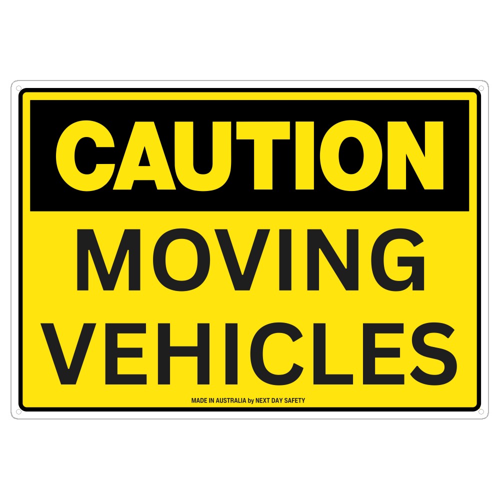 A yellow and black sign that reads ‘Caution Moving Vehicles’, designed to alert pedestrians and staff to the presence of vehicles in the area.