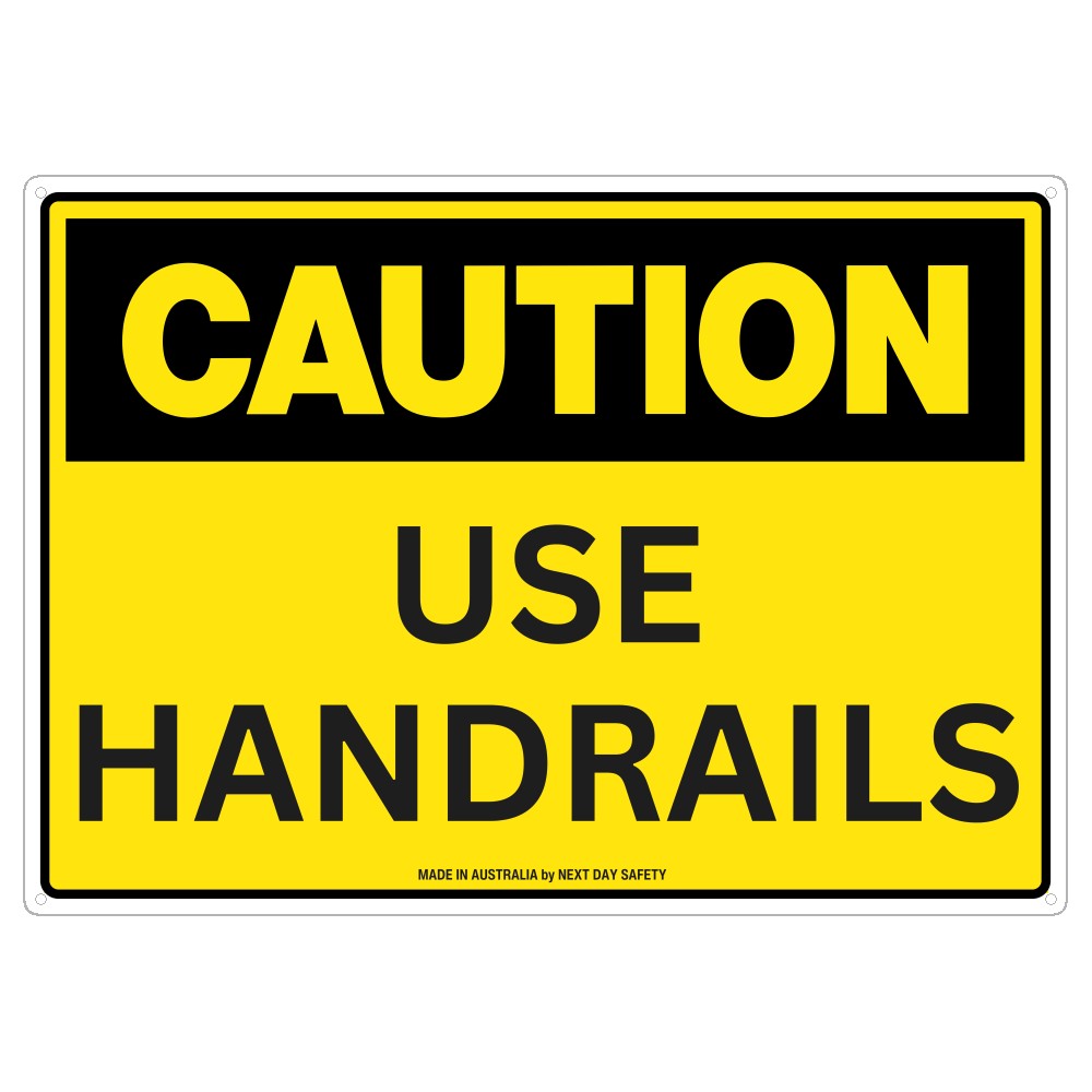 This ‘Caution Use Handrails’ sign is designed to remind staff and visitors to use handrails where available to prevent slips, trips, and falls. Display this sign near stairways, ramps, walkways, building entrances, or any areas where handrails are present and should be used for safety.
