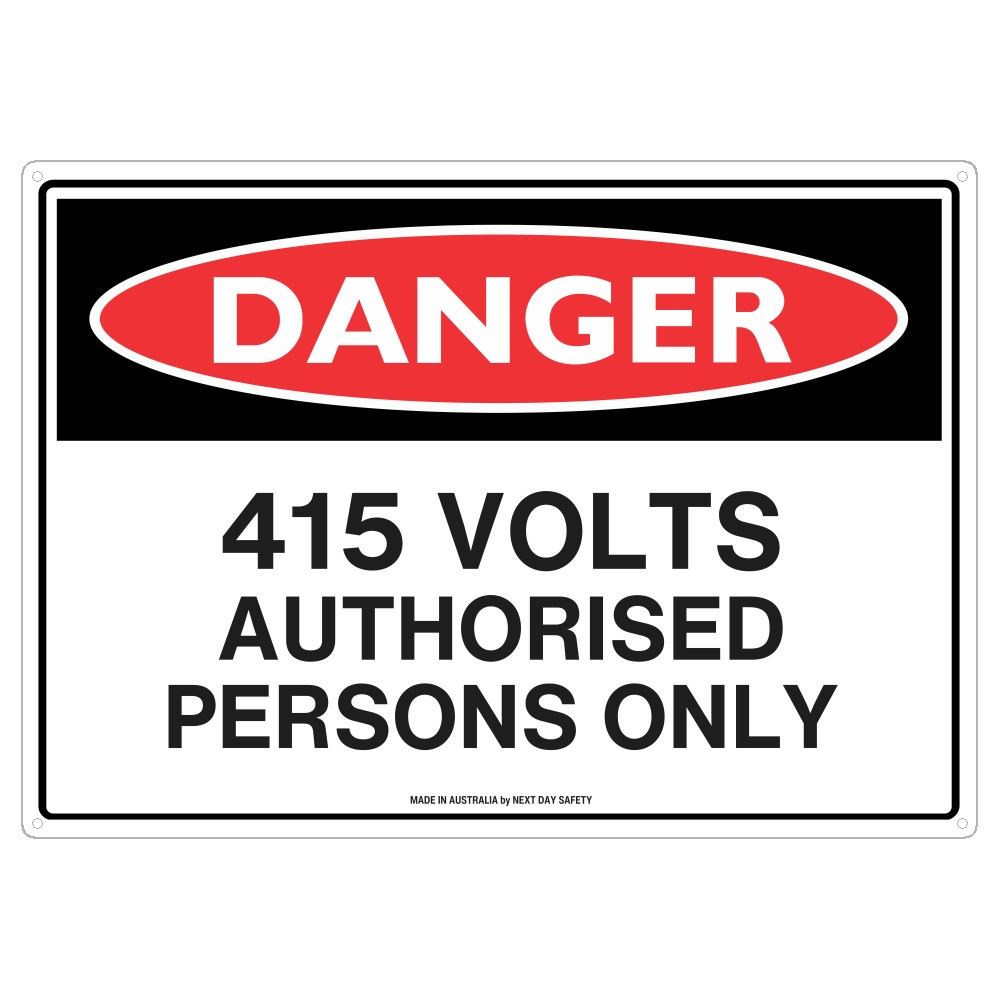 This ‘Danger 415 Volts Authorised Persons Only’ sign is designed to warn of the presence of high voltage electrical equipment. It makes clear that only authorised individuals should enter or work in the area, helping to prevent unauthorised access and potential accidents.