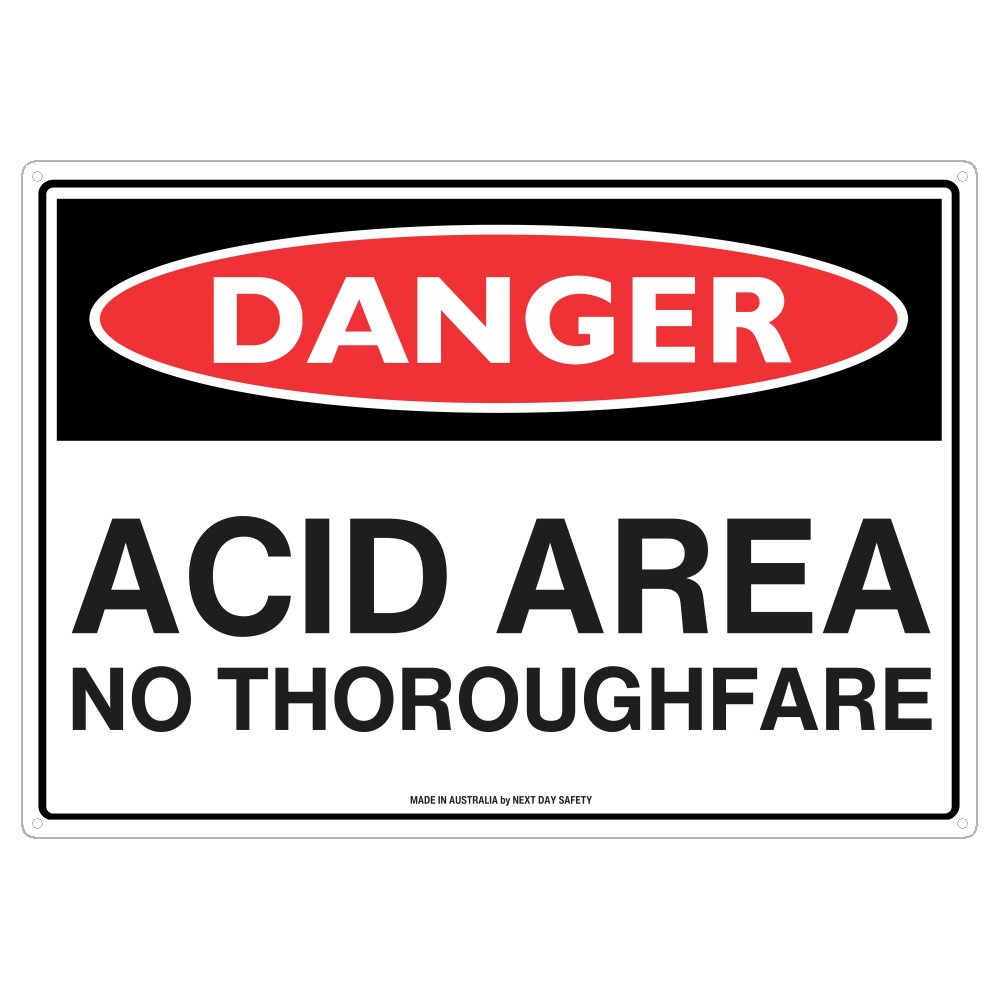 This Danger Acid Area No Thoroughfare sign clearly marks areas where acid hazards are present and restricts access to authorised personnel only. Commonly used in chemical processing plants, laboratories, and industrial environments, this sign helps warn staff and visitors to keep away from potentially dangerous zones.