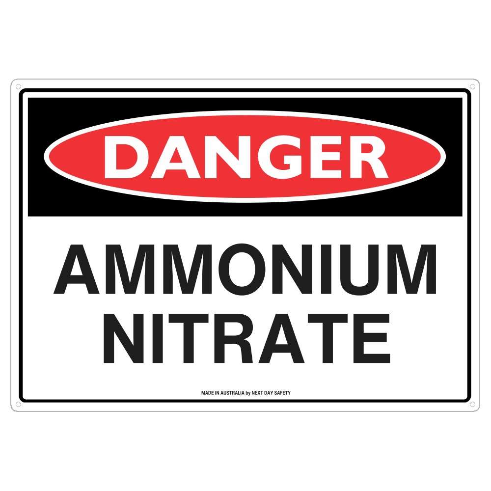 This ‘Danger Ammonium Nitrate’ sign is crucial for areas where ammonium nitrate is stored or handled, such as mining sites, quarries, chemical plants, and agricultural supply facilities. Visible placement of this sign helps alert workers and visitors to the hazardous nature of ammonium nitrate in the vicinity.