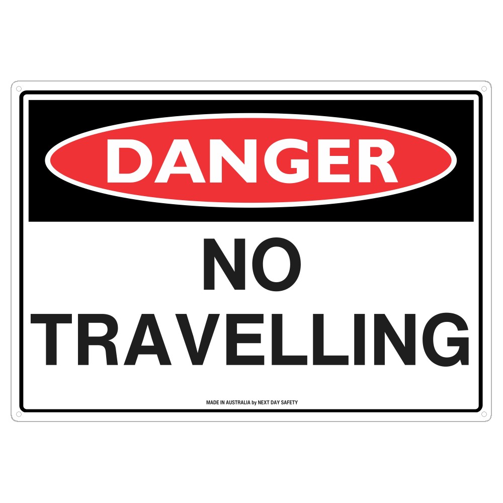 This sign displays the message ‘Danger No Travelling’ to warn individuals not to travel beyond this point, commonly used in environments with machinery, rail operations, or restricted access zones.