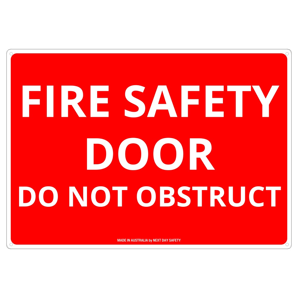 This sign features a bold red background with clear white text stating ‘Fire Safety Door Do Not Obstruct’. It is designed to be easily visible and instantly readable.