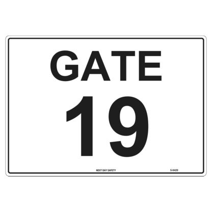 Perfect for clearly marking gates at industrial sites, transport hubs, or large facilities, the ‘Gate 19’ sign assists with navigation and organization. Manufactured by Next Day Safety, this sign can be used to help visitors and employees identify the correct gate at airports, shipping ports, or sporting arenas. Printed to order, typically on the same day, and shipped across Australia.