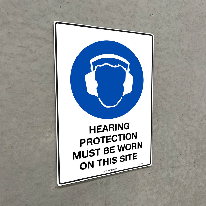 Mandatory hearing protection areas on construction sites, in manufacturing plants, or at airports are clearly marked with this sign. It serves as a visual cue to remind workers and visitors to use ear protection to safeguard against potential hearing damage from loud noises. This sign is produced by Next Day Safety and printed in-house, ensuring delivery within Australia the next day. Made with high-quality materials, this sign meets workplace safety regulations in Australia.