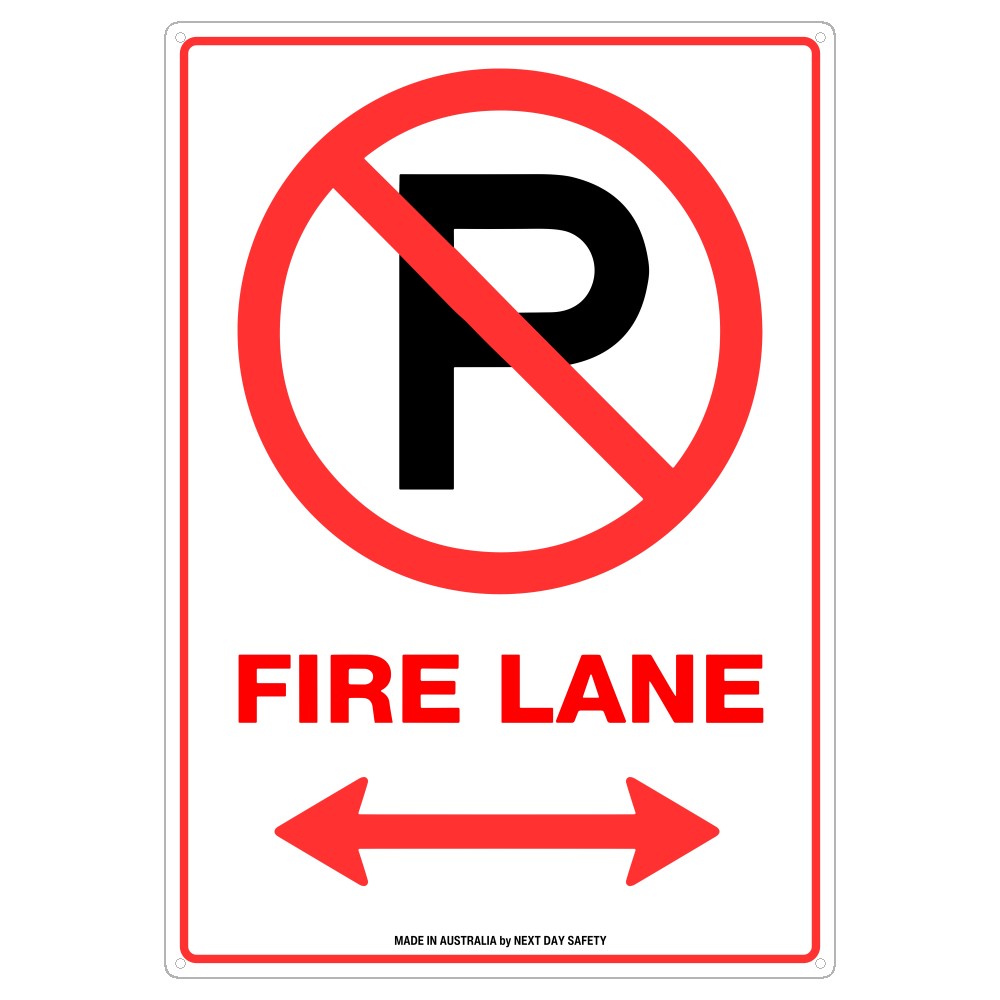 The sign features a ‘No Parking’ symbol over a ‘P’, with the words ‘Fire Lane’ below and a double-headed red arrow indicating the extent of the fire lane.