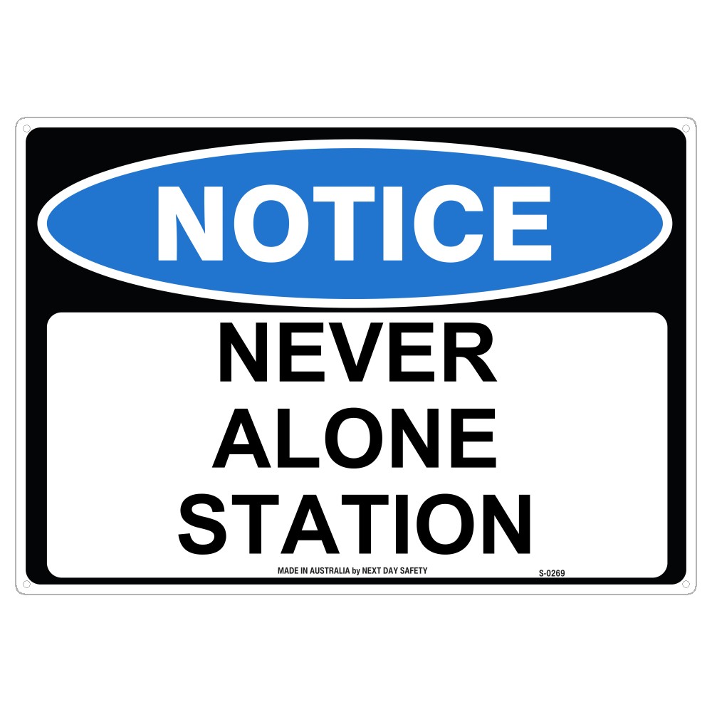 This ‘Notice Never Alone Station’ sign is ideal for environments where staff safety or protocol requires that employees work in pairs or teams, and are never left alone. Commonly used in laboratories, chemical handling facilities, high-risk industrial sites, or locations where health and safety regulations mandate team-based operation.