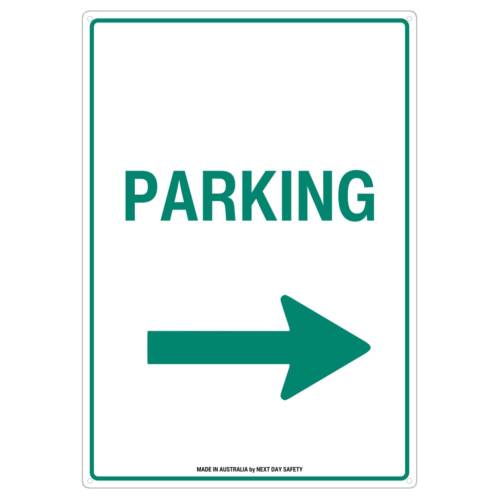 This ‘Parking →’ sign is designed to clearly indicate the direction to parking areas. The bold green text and arrow on a white background make it easily visible from a distance, helping to direct drivers efficiently.