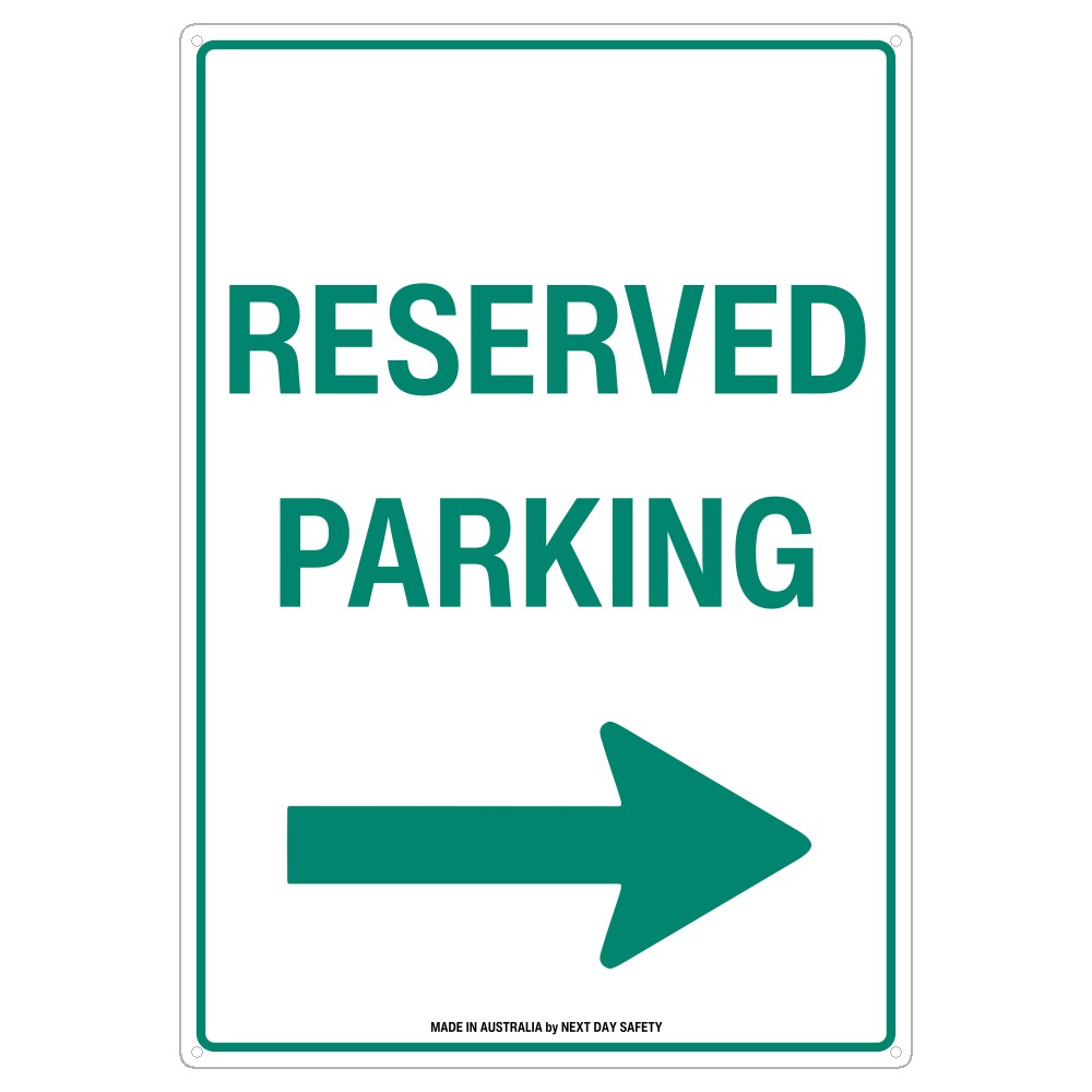A sign with the words ‘Reserved Parking’ and a right-facing arrow, indicating designated parking spaces.