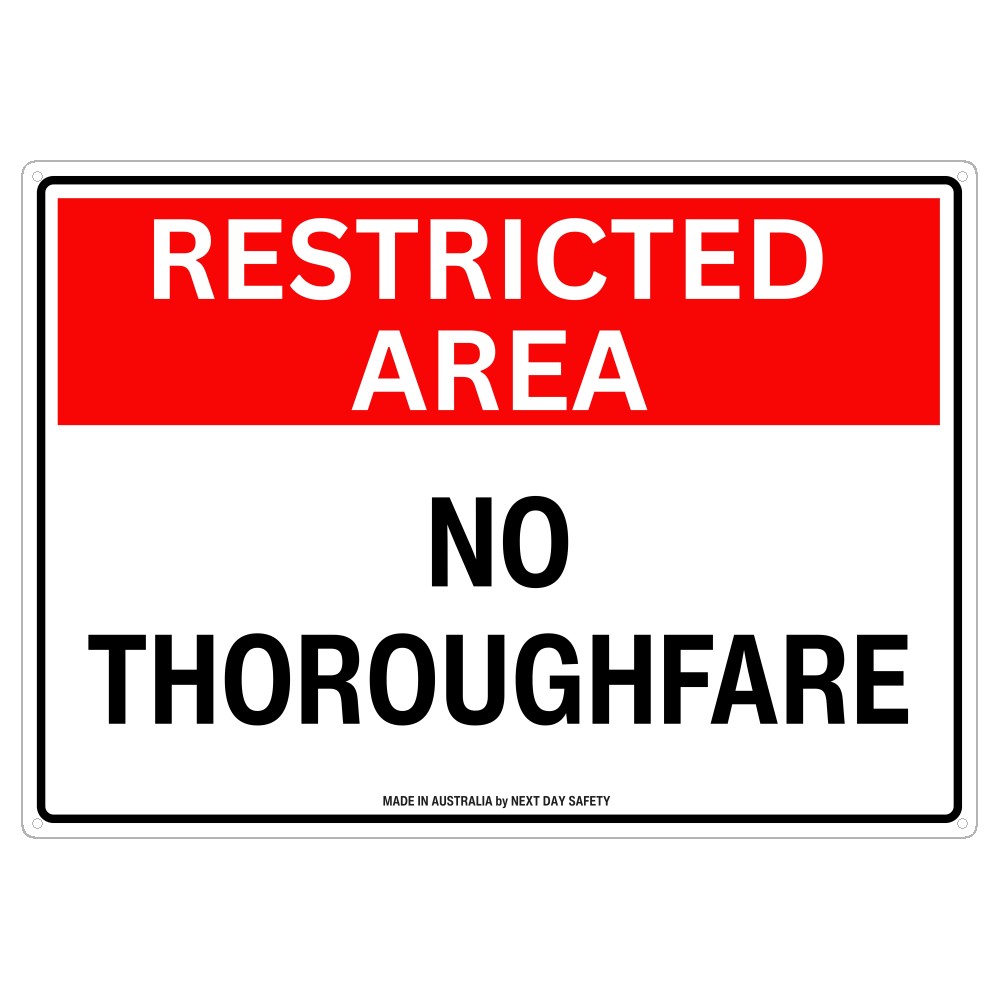 This Restricted Area No Thoroughfare sign is designed to prevent unauthorised entry and direct foot traffic away from sensitive or private zones. Commonly installed in warehouses, construction sites, research labs, and private properties, this sign helps comply with Australian workplace safety requirements. View our full range of safety signs or contact Next Day Safety for more details.