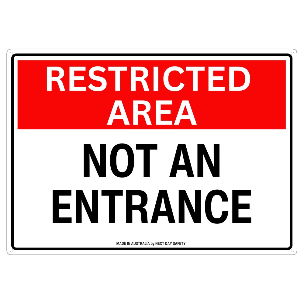 This sign displays the warning ‘Restricted Area Not An Entrance’ with clear, bold text. It is designed to prevent unauthorised access by informing people that the area is not an entry point.