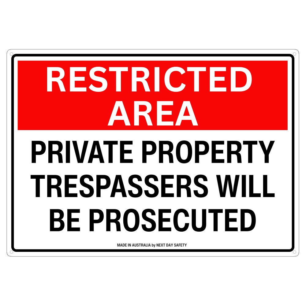 This sign displays the messages ‘Restricted Area’ and ‘Private Property Trespassers Will Be Prosecuted’ in bold lettering for clear warning.