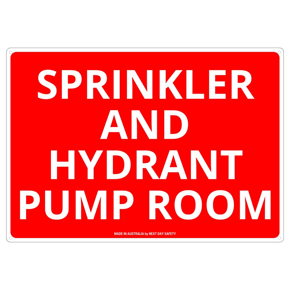 This sign features bold white text on a red background, clearly indicating the location of the sprinkler and hydrant pump room.