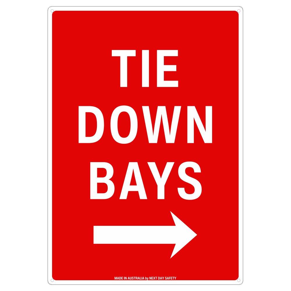This Tie Down Bays Right Arrow sign is ideal for warehouses, depots, logistics hubs, and industrial sites where designated tie down bay locations need to be clearly marked for efficient vehicle and equipment securing operations. The clear arrow helps direct drivers and operators to the correct bays, improving site safety and workflow.